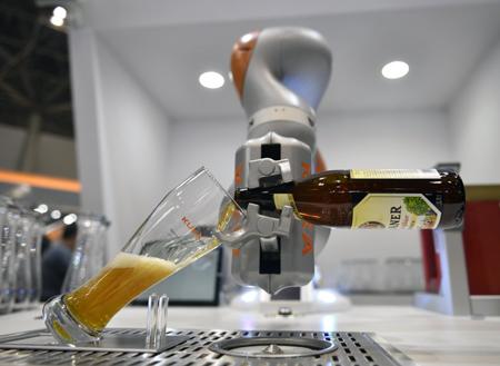 11月29日,在日本東京舉行的2017國際機器人展上,德國庫卡公司制造的機器人在表演倒啤酒。