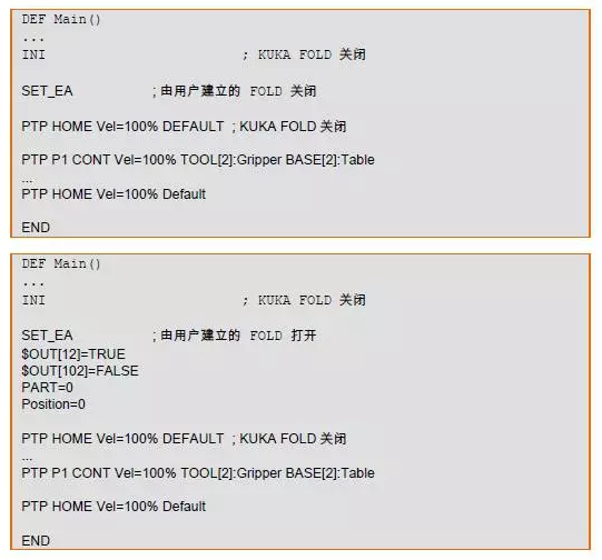 除此之外,用戶(專家用戶組以上)還可以創(chuàng)建自己的 Fold。這些 Fold 例如可以由程序員使用,使用時雖然可以通知操作人員在程序的一定位置處發(fā)生的事件,但在后臺仍保持實際的 KRL 句法。Fold 通常在創(chuàng)建后首先顯示成關(guān)閉狀態(tài)。