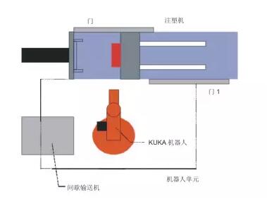 機器人的任務(wù)是將塑料制品從一臺注塑機中取出。制品用真空吸盤吸住,再堆放到注塑機旁的一臺間歇輸送機上
